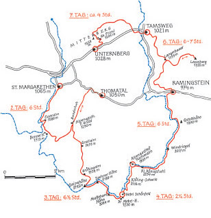 2. Tag: Von St. Margarethen auf Waldwegen über die Esseralm, 1589 m, zur Bonner Hütte, 1713 m. 3. Tag: Von Thomatal, 1050 m, durch die Weißseite über die Grössingalm zur Gaipahöhe, 2192 m – Zechnerhöhe, 2188 m – Mattehanshöhe, 2086 m. Abstieg in das Schönfeld vorbei an der Dr.-Josef-Mehrl-Hütte, 1730 m, zum Gasthof Zwergbirke (Nächtigung) mingstein, Ortsteil Triebling, 974 m. Vorbei an der Sprungschanze und KFZ-Werkstätte über die Bundesstraße und Murbrücke den Radweg entlang bis Madling. Nächtigung. Gehzeit 6 Stunden; 400 Hm Aufstieg, 1200 Hm Abstieg. 4. Tag: Aufstieg an der Westseite unter dem Schilchernock in die Klölingscharte, 2116 m. Abstieg durch den Talschluss der Klölingalm zum Gasthof Rückl. 1893 m. Nächtigung. Gehzeit 2 1/2 Stunden; 400 Hm Aufstieg, 250 Hm Abstieg. 5. Tag: Aufstieg zum Kleinen Königstuhl, 2254 m. Nun ca. 6 km langer Höhenweg über Feldernock, Vordereck,Windriegel zur Gstoßlacke und Baierlhütte zur Gstoßhöhe, 1890 m. Abstieg über die Mühlhauserhütte nach Ramingstein, Ortsteil Triebling, 974 m. Vorbei an der Sprungschanze und KFZ-Werkstätte über die Bundesstraße und Murbrücke den Radweg entlang bis Madling. Nächtigung. Gehzeit 6 Stunden; 400 Hm Aufstieg, 1200 Hm Abstieg.