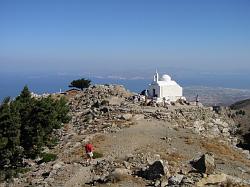 Jetzt geht es merklich steiler auf schmalem Felspfad im lichten Wald bergauf. Hin- und wieder weist ein Steinmann den Weg. Wenn auch der Weg kaum ausgezeichnet ist (einige blasse, blaue Farbkleckse sind hin und wieder zu erkennen), so kann man mit ein wenig Orientierungssinn den Weg kaum verfehlen. Nach 30 Minuten Anstieg (ab Abzweig Sandsträßchen) verlässt man mit herrlichen Ausblicken die Waldgrenze und ist dann froh, wenn man einen frühen Aufbruch gewählt hat. Denn jetzt ist man der Sonne völlig ausgesetzt. Man gewinnt über einige Felsen ohne Schwierigkeiten eine weitere Geländestufe und erreicht dann nach weiteren 10 Minuten eine jochähnliche Anhöhe, die zum ersten Mal einen Blick auf das blauglitzernde Meer der Südküste freigibt. Hier führt der Pfad in nur noch mäßiger Steigung nach links (südöstlich) und hält sich immer auf der Nordseite des Kamms. In weiteren 10 Minuten erreicht man ein weiteres Joch, wo schließlich der Blick auf den restlichen Anstieg und den Gipfel mit Kapelle frei wird. Erfahrene Bergwanderer könnten auch den erkennbaren Blockgrat, recht unschwierig zum Gipfel wählen (anstrengend). Empfehlenswert ist jedoch der deutlich sichtbare Pfad, der im nordseitigen Berghang den Gipfel gewinnt.