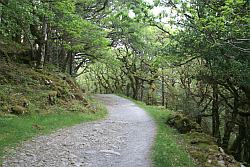 Der Weg führt dann entlang des Owengarriff Rivers auf dem Kerry-Weges ein kurzes Stück bis zum Torc Wasserfall. Hier steigt der Pfad steil den Berg hinauf . Danach wird der Weg wieder flacher und führt schließlich nach einer Verzweigung über eine Steinbrücke. Nach der Brücke biegt man scharf nach links ab und geht auf dem Kerry-Weg weiter durch ein stark bemoostes Waldstück. Am Ende des Waldes geht es noch ein Stück dem Owengarriff Rivers entlang, bis rechts ein Wegweiser zum Torc Mountain sichtbar wird. Diesem Weg folgt man weiter. Dabei geht es über weite