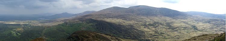 Richtung Süden bietet sich ein breites Panorama zum Mangerton Mountain. Im Westen sieht man die Berge der Macgillycudd's Reeks.