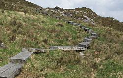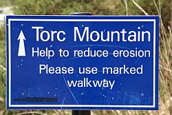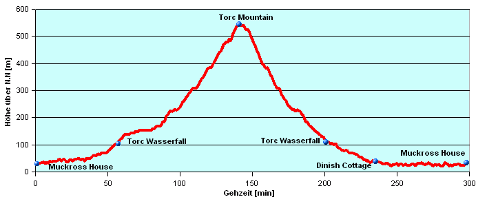 Mangerton Mountain (843 m) Der Abstieg geht wie der Aufstieg zurück über den Torc Wasserfall zur N71. An der N71 kann man sich entscheiden, ob man direkt zurück zum Muckross House geht, oder die Hauptstraße für 1.5 km nach Westen weitergeht, um dann den Wegweisern zur Dinish Cottage zu folgen (Gehzeit Torc Mountain - Dinish Cottage 1,5 h). Von dort aus umrundet man weiter den Muckross Lake bis man schließlich ebenfalls zum Muckross House zurückkehrt. (Gehzeit Dinish Cottage - Muckross House 1 h. Gesamte Gehzeit mit Umrundung des Muckross Sees: 5 h Höhendifferenz im Aufstieg: 500 hm |