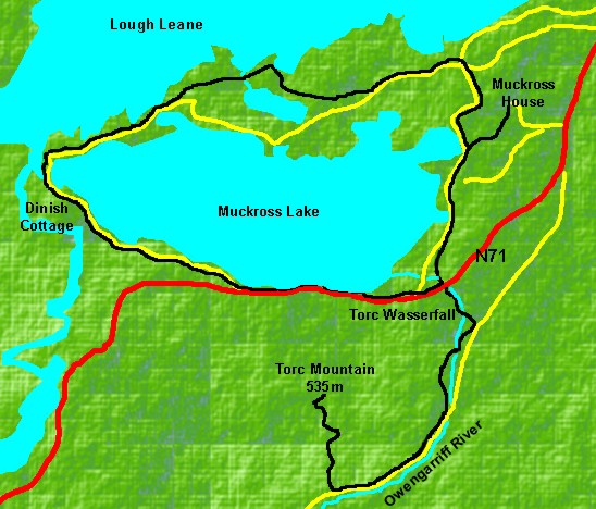 Vom Parkplatz aus geht man zur Vorderseite des Herrschaftshauses und von dort weiter zum See. Ein markierter Weg zum Torc Wasserfall führt zunächst durch den Park zur Hauptstraße N71, die beim Parkplatz Torc Wasserfall überquert wird.