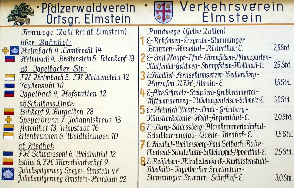 Elmstein, Iggelsbach und 13 kleinere und größere Annexe bilden die Gemeinde Elmstein. Der Ort hat ca. 3000 Einwohner. Historisch gesehen verdankt Elmstein seine Entstehung dem Bau der Burg Elmstein im 12. Jahrhundert. Die Ruinen der Burg sind heute in Privatbesitz. Seit 1909, dem Jahr der Eröffnung der Talbahn, wird Elmstein als Ausgangspunkt für für Wanderungen genutzt. Diese Bahn verkehrt heute an Wochenenden und Feiertagen als Museumsbahn, dem sogenannten "Kuckucksbähnel" und verbindet die Orte Neustadt a. d. Weinstraße, Lambrecht mit Elmstein. Bei einem Besuch in der "alten Samenklenge", die 2008 als Museum eröffnet wurde, erfährt man interessantes aus der Forst- und Waldgeschichte. Sehenswert sind auch die Wappenschmiede und das Waldarbeitermuseum.