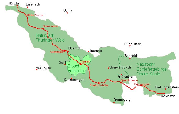 Länge von 169,3 km durchquert er den Naturpark Thüringer Wald, das