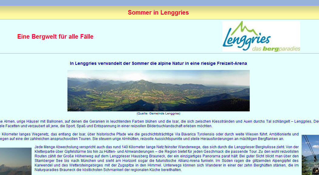 Wanderurlaub und Loipenangebot. Einbindung: http://www.wandertipp.de/regionenframe.htm | Beispiele: http://www.wandertipp.de/Regionen/BayernAlpen/Lenggries-Sommer.htm Verlage Vorstellung Ihres Verlages mit Ihren Titeln und